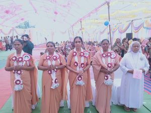 भव्यस्वागत। …..थांदला ..सिस्टर अमृता के धर्मसंघीय जीवन में वृत धारण किए 25वर्ष पूर्ण होने पर सिल्वर जुबिली पर अपने गृह ग्राम मस्का महुदी पहुंचने पर ग्राम पंचायत के सरपंच तथा ग्रामीणों एवम परिजनों ने भव्य स्वागत किया इस अवसर पर कैथोलिक डायसिस उदयपुर के बिशप देवप्रसाद गणावा तथा कैथोलिक डायसिस झाबुआ के बिशप पीटर रुमाल खराड़ी उपस्थित थे समारोह के पूर्व चर्च परिसर से बाजे गाजे के साथ नृत्य करते हुए युवक युवतियां पंडाल तक पहुंचे जहां पंचायत के सरपंच तथा ग्रामीणों के साथ परिजनों ने स्वागत किया। स्वागत समारोह में सिस्टर अमृता के साथ आई धर्म बहने सिस्टर लियो सिस्टर अरुणा सिस्टर नीलम सिस्टर सरिता का भी स्वागत किया गया। फादर मार्कुस ग्रासिया वे भी अपने आजीवन व्रत धारण करने केपुरोहिताई जीवन के 25वर्ष की जुबिली मना रहे स्वागत किया गया।स्वागत समारोह के दौरान दोनों बिशप के साथ 55पुरोहितों ने मिस्सा पूजा में भाग लिया। इस अवसर पर दोनो बिशप पीटर खराड़ी एवम देवप्रसाद गणावा ने धर्म बहनों तथा फादर को बधाई दी। समारोह के दौरान बालिकाओं द्वारा नृत्य भी प्रस्तुत किया। दोनो बिशप को साफा तथा शाल ओढ़ाकर सम्मानित किया।कार्यक्रम में पल्ली पुरोहित फादर अरुण गणावा एवम सहायक फादर का योग दान सराहनीय रहा फादर स्टीफन रावत ने सभी अतिथियों का आभार माना।